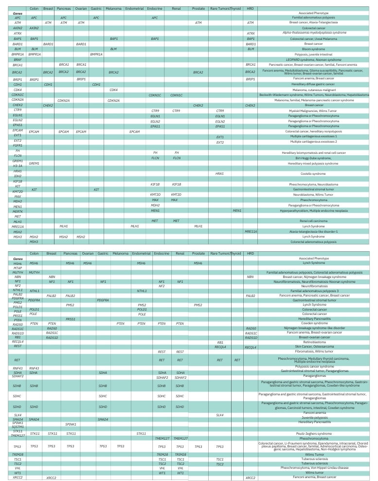 Στον παρακάτω πίνακα αναφέρονται γονίδια που αναλύει η εξέταση HerediGene γνωστά για συνήθη καρκινικά σύνδρομα (όπως σύνδρομο Lynch για τα κληρονομικά σύνδρομα καρκίνου του παχέος εντέρου και του ορθού) και συνήθεις τύπους καρκίνου.